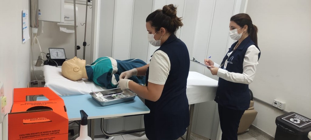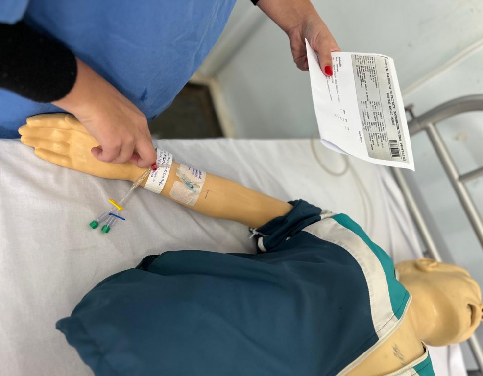 Dando continuidade aos treinamentos anuais para aprimorar as práticas de administração de medicação, as coordenações de Enfermagem dos hospitais Emílio Carlos e Padre Albino realizaram, nos dias 27 e 28 de maio, no HEC, e de 03 a 07 de junho, no HPA, nls períodos da manhã, tarde e noite, treinamentos práticos com as equipes de assistência sobre preparo e administração de medicação conforme Protocolo de Segurança na Prescrição e Administração de Medicação/PSPAM. Estações foram montadas para que os participantes pudessem desenvolver as etapas do preparo e administração de medicação, vivenciando na prática todo o processo numa situação real.