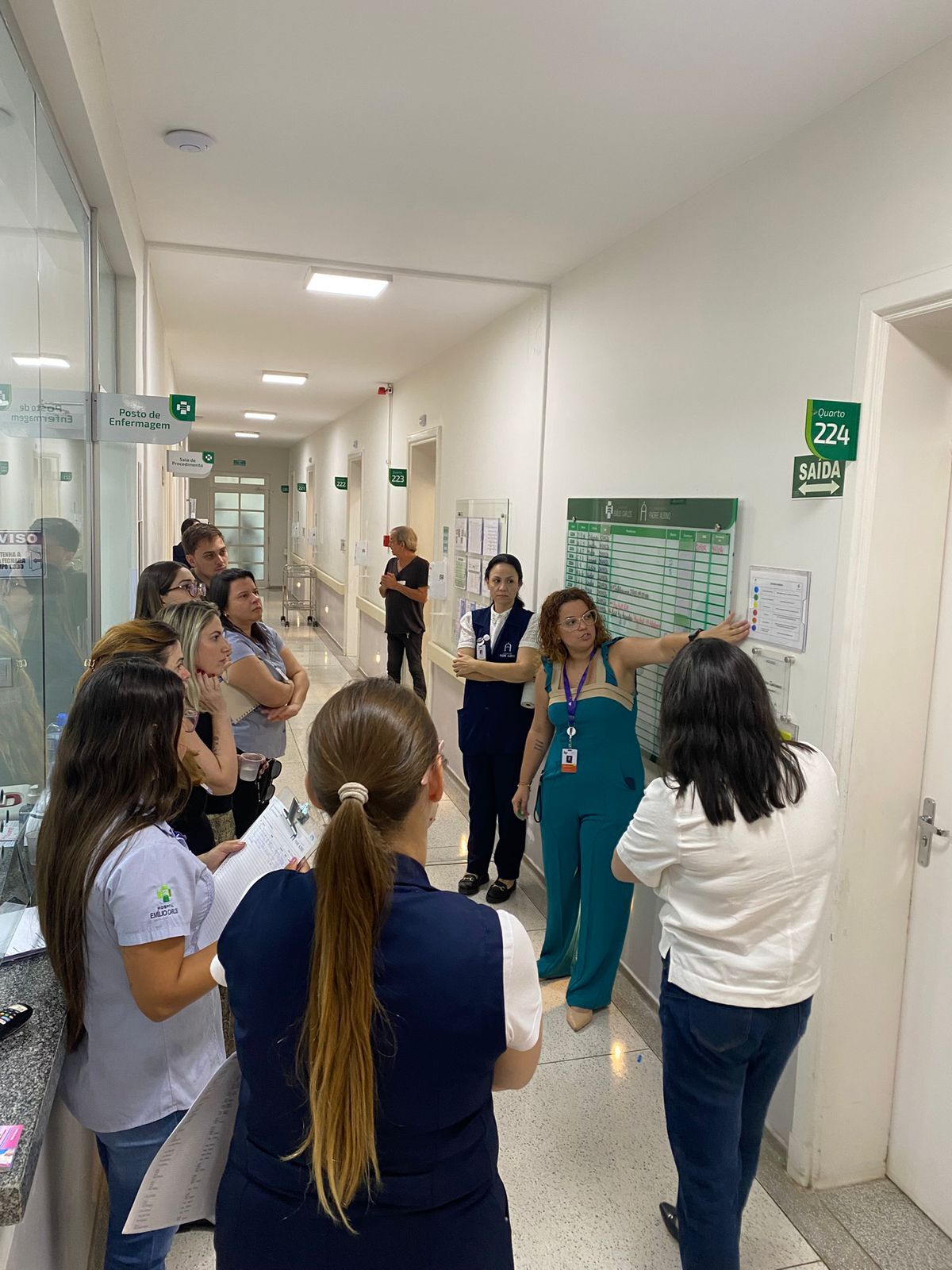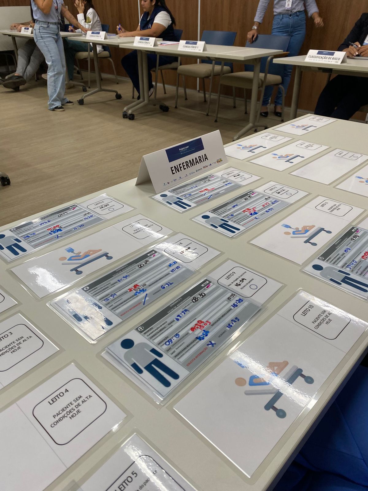 No primeiro dia de alinhamento uma dinâmica lúdica envolveu colaboradores de diferentes setores, tanto assistenciais quanto administrativos, simulando plantão de 24 horas. A atividade foi dividida em duas etapas: na primeira, sem critérios definidos, foi possível observar o fluxo espontâneo de trabalho; na segunda, com critérios estruturados e planos de ação estabelecidos, evidenciando, na prática, os ganhos obtidos com as melhorias implementadas. As consultoras também acompanharam a realização dos Huddles, reuniões rápidas de alinhamento, com o objetivo de identificar oportunidades de aprimoramento. A programação incluiu ainda aula sobre gestão de leitos hospitalares, reforçando conceitos importantes para a organização dos fluxos assistenciais.